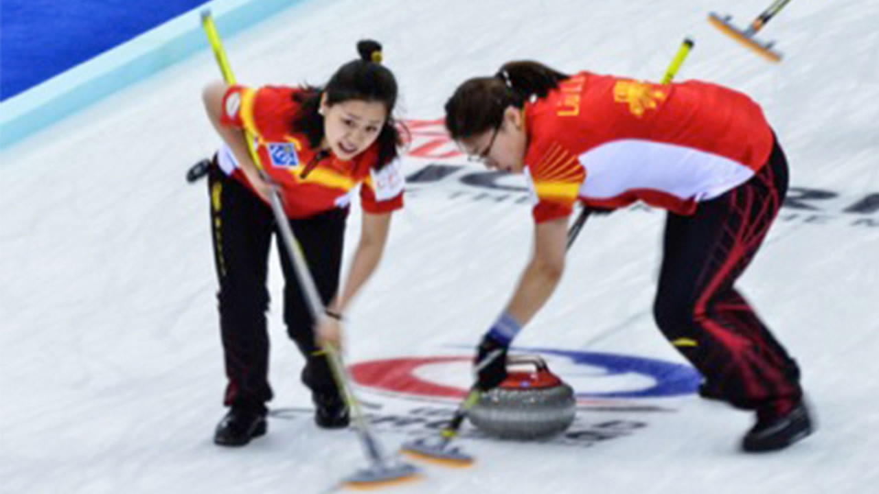 Wang Rui and Liu Jinli sweeping the ice in the game agaisnt Scotland. /CFP Photo