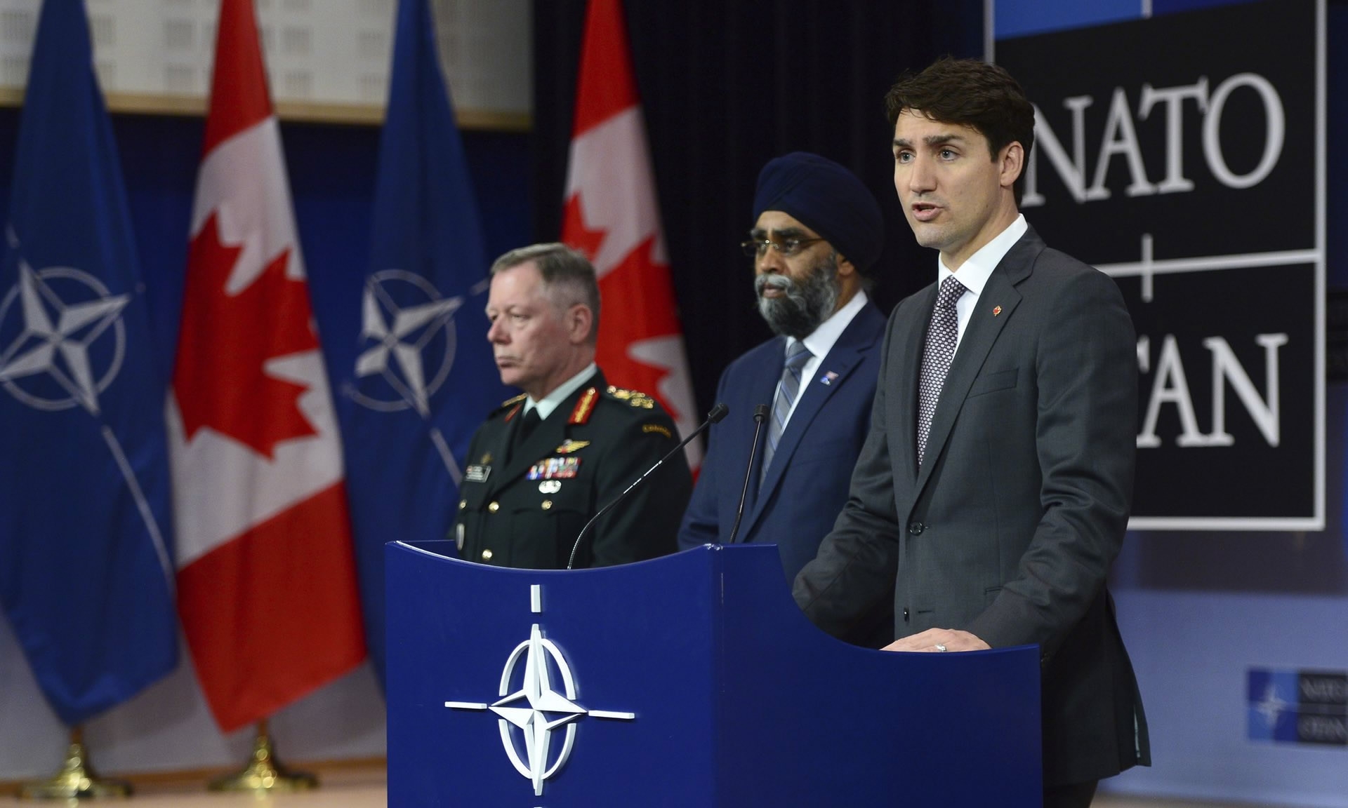 Canadian PM Justin Trudeau with Defence Minister Harjit Singh Sajjan and Chief of Defence Staff Jonathan Vance at NATO at the end of May. /AP Photo
