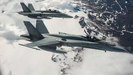 Two Royal Canadian Air Force CF-188 Hornet fighters from 433 Tactical Fighter Squadron fly over Iceland during a surveillance mission on May 31, 2017. /Reuters Photo