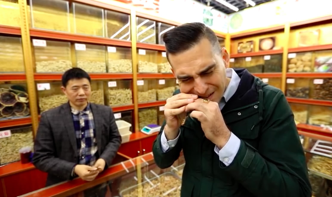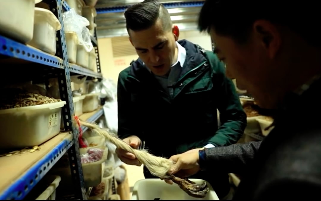 A TCM vendor shows Rediscovering China reporter, Joey Catanzaro, a sample of donkey’s penis, believed to cure infertility in men. /CGTN Photo