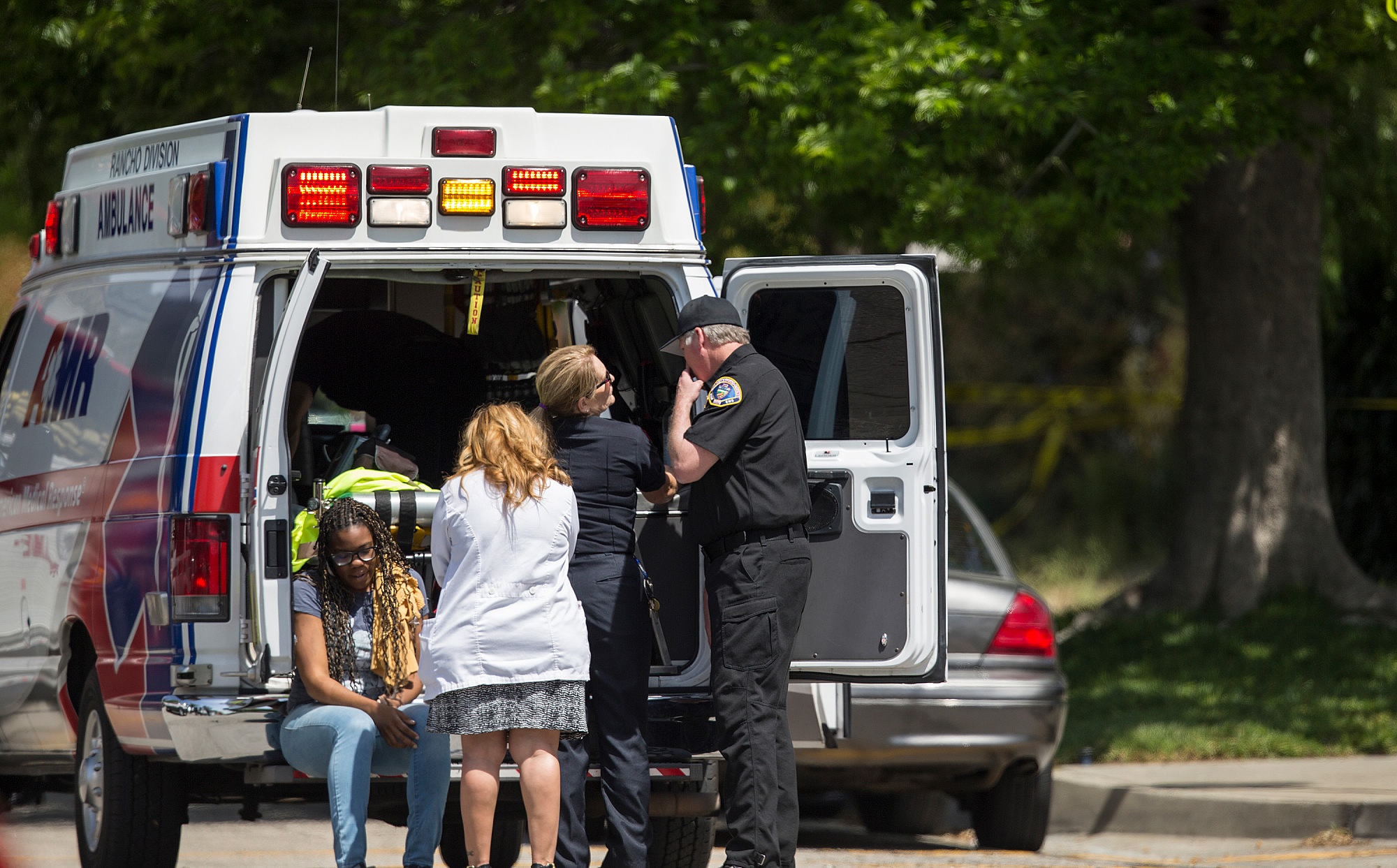A woman is tended to as she sits on the back of an ambulance after a shooting inside North Park Elementary School on April 10, 2017 in San Bernardino, California. /CFP Photo