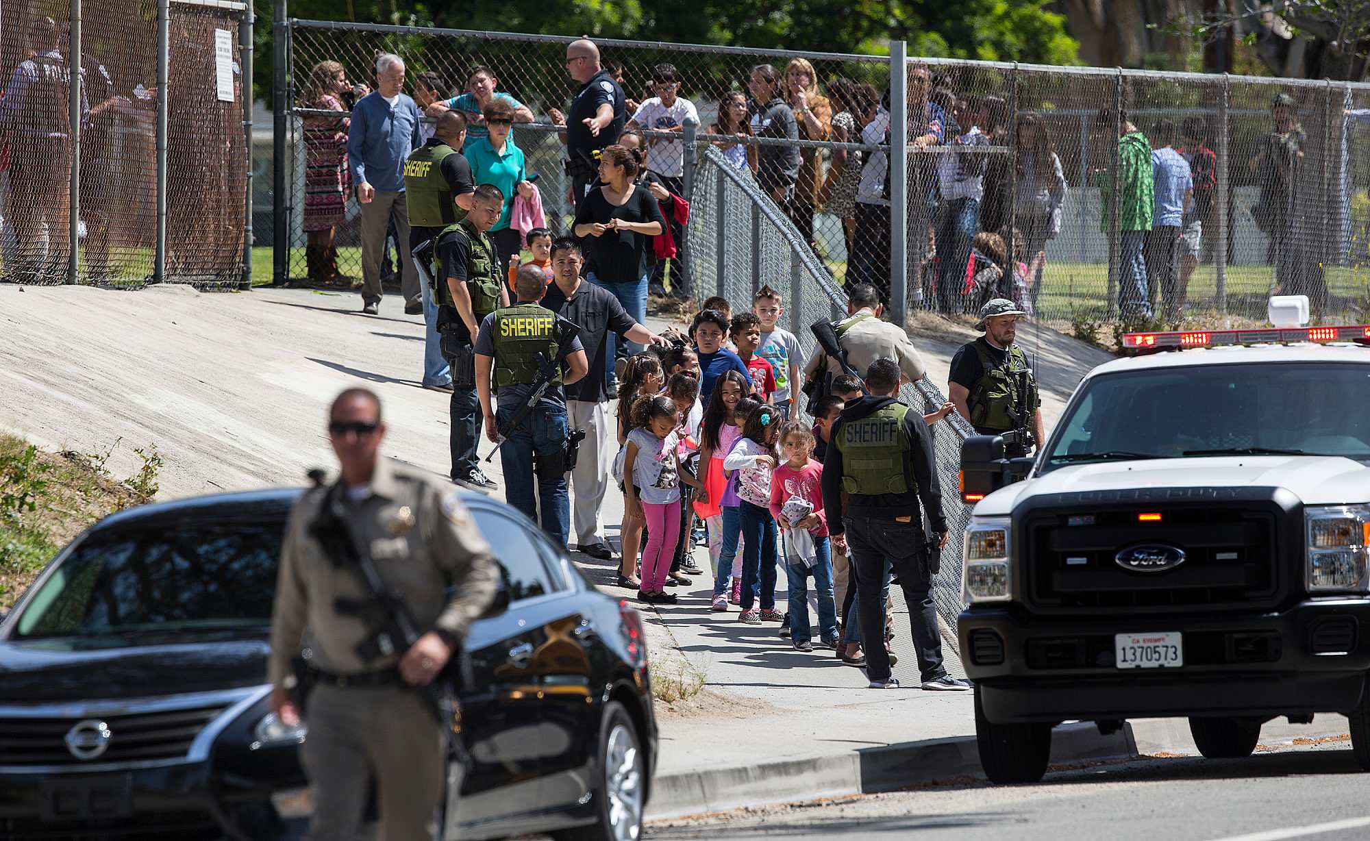 Police said the two students, both boys, were believed to have been caught in the gunfire unintentionally as bystanders to Monday's shooting, which took place about 13 kilometers from where a radicalized Muslim couple killed 14 people in a December 2015 shooting rampage.