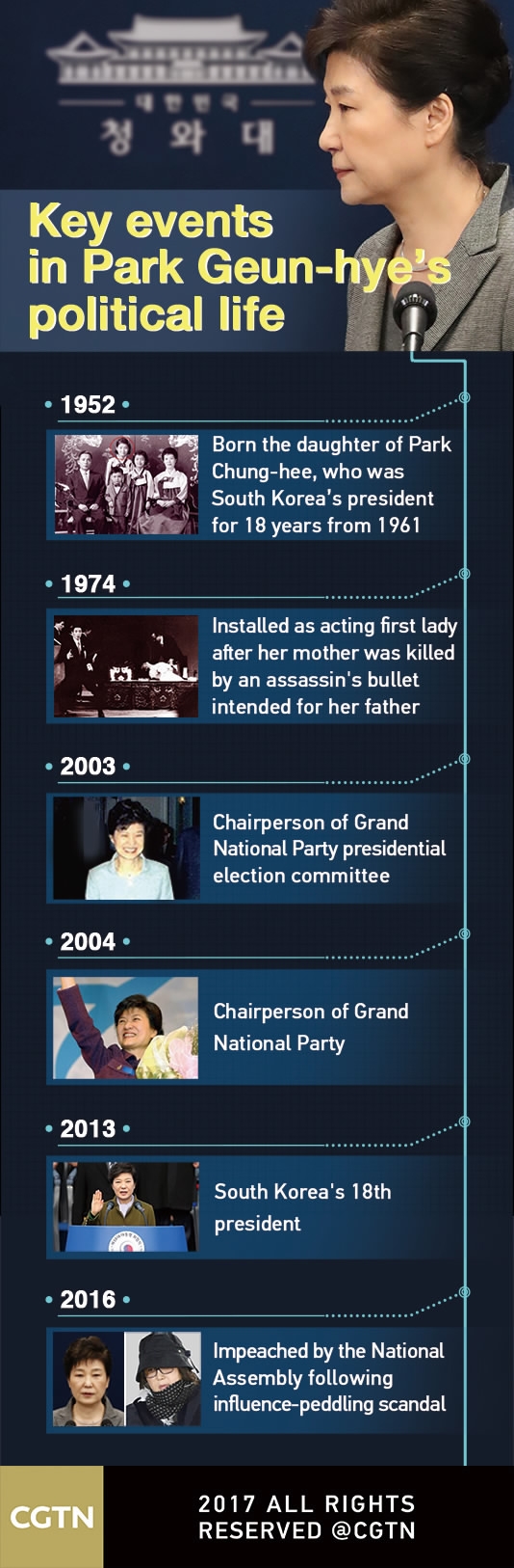 Park was once considered a trailblazer, vowing to improve the economy by boosting creativity and entrepreneurship after taking office. Following her election victory in 2013, she promised a "new era" of government and that she would be a "president for the people."