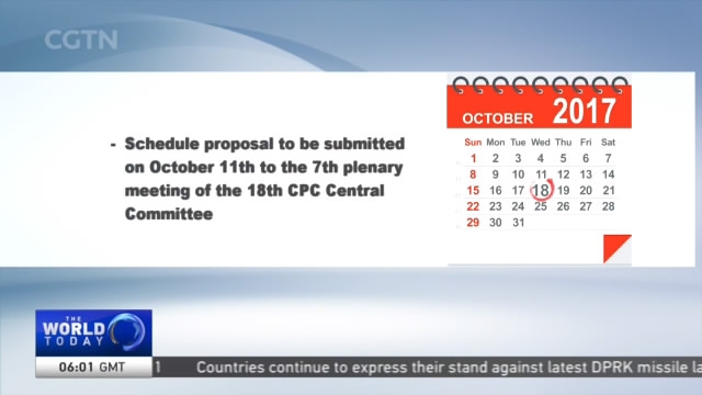 We begin with China's most important political event of the year. The 19th National Congress of the Communist Party of China is expected to convene on October 18th in Beijing. The Political Bureau of the CPC Central Committee decided at a meeting on Thursday to submit a proposal on the schedule to the seventh plenary meeting of the 18th CPC Central Committee, which will be held on October 11th. Thursday's Political Bureau meeting was presided over by Xi Jinping, General Secretary of the CPC Central Committee.