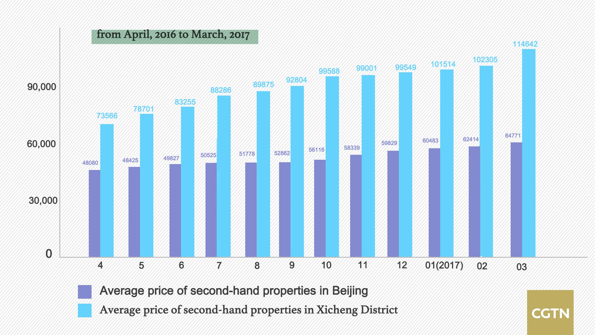 Properties in Xicheng District saw a 60% price bump y-on-y while the average price in Beijing increased by 40%. /Data Source: Fang.com
