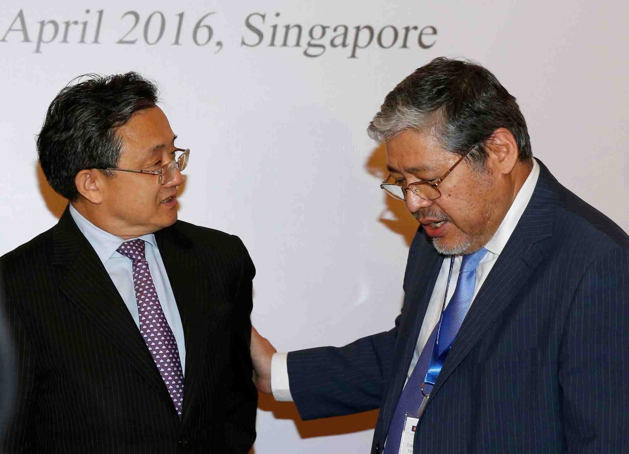 China's Vice Minister of Foreign Affairs Liu Zhenmin speaks with the Philippines' delegation leader Enrique A. Manalo (R) before an ASEAN-China senior officials meeting in Singapore on April 27, 2016. /CFP Photo