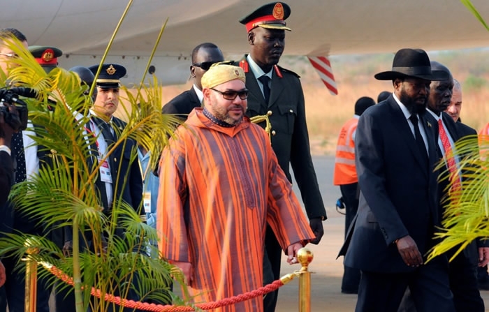 King Mohammed VI of Morocco (L) is welcomed by South Sudan's President Salva Kiir upon arriving at the Juba airport in South Sudan's capital Juba on February 1, 2017. /CFP Photo