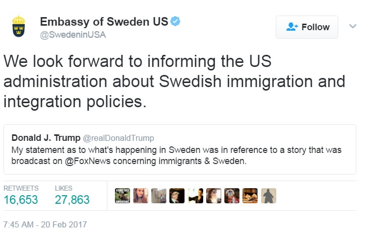 The President had addressed supporters during a rally in Florida on Saturday that “you look at what’s happening in Germany, you look at what’s happening last night in Sweden.”