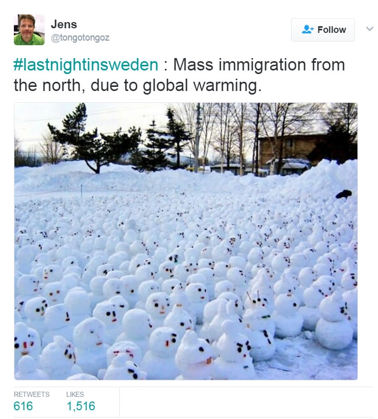 The hashtag #LastNightInSweden soon started trending as one of the most popular online topics on social media platform Twitter, forming a wave of ridiculing the groundless comments by Donald Trump.