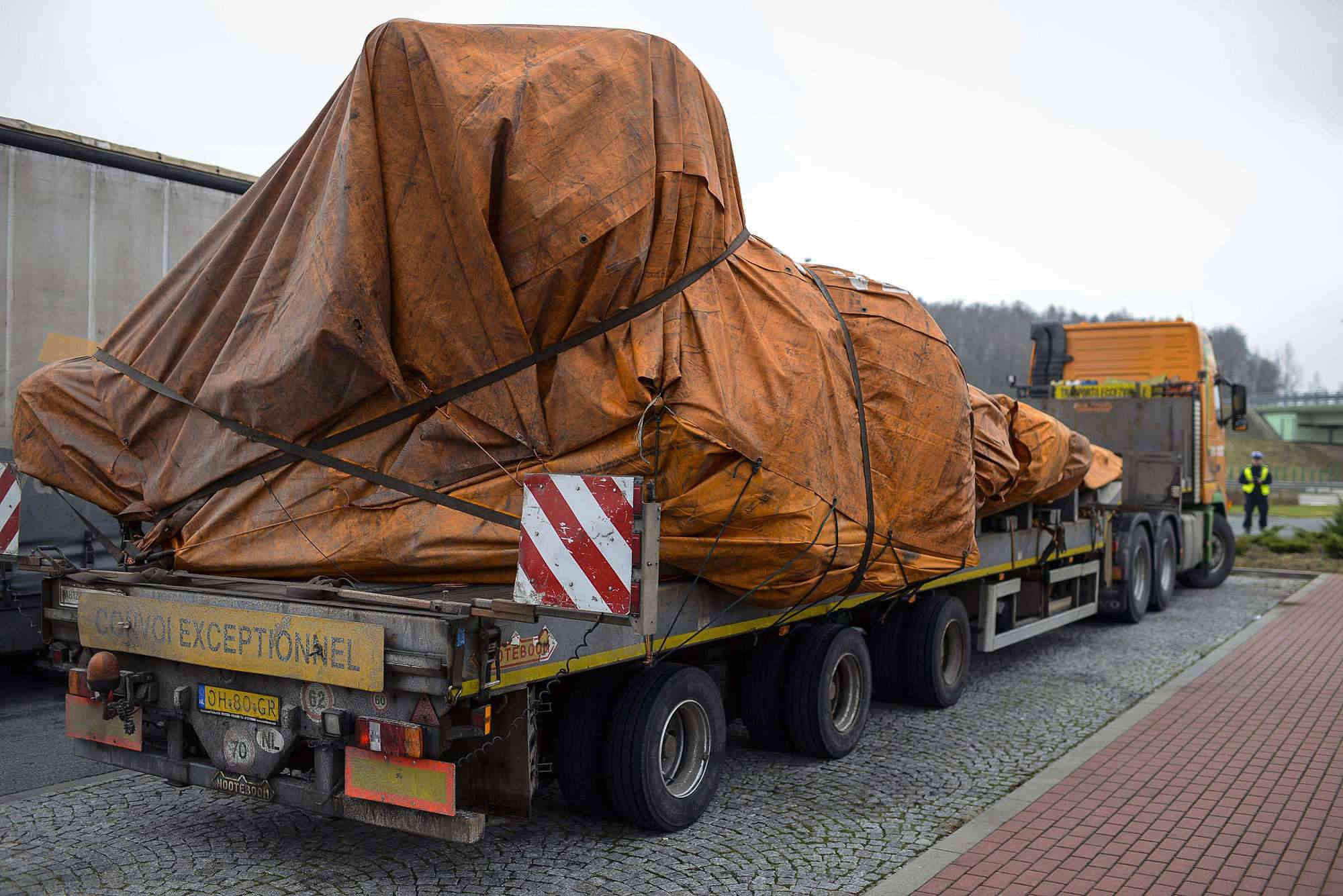 A Polish police officer guards the remnants of Malaysia Airlines flight MH17 loaded on a truck in Zarska Wies, Poland, near the German town of Goerlitz December 7, 2014. /VCG Photo