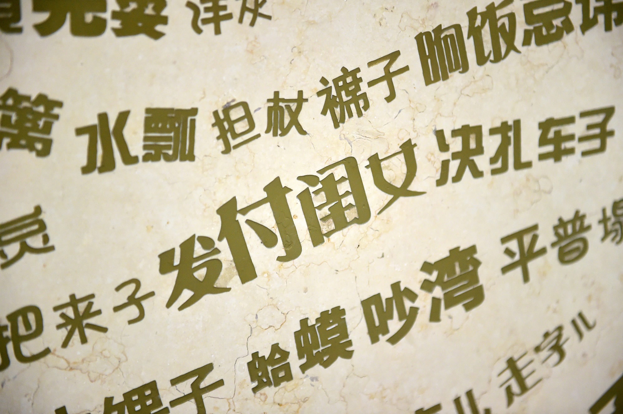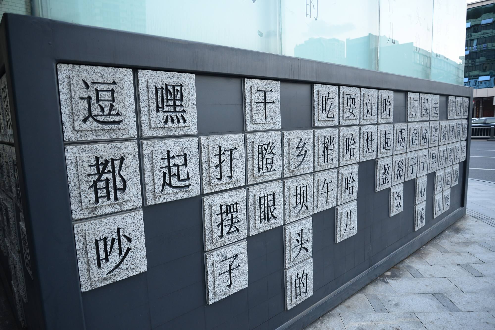 A wall of character modules of Chengdu dialect beside a subway station. /VCG Photo