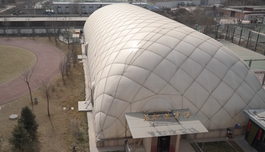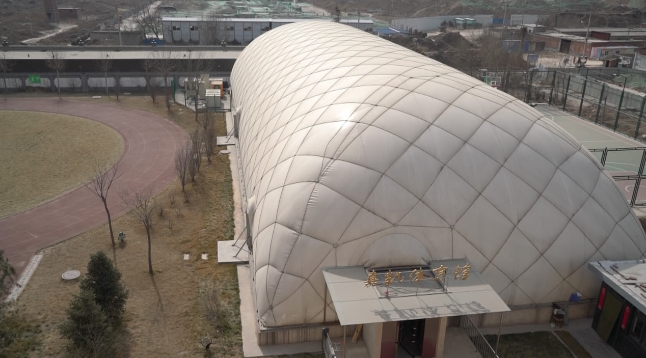 Outside view of the bubble-like stadium in Huaxing primary school, Shijiazhuang. /Photo by Ning Hong