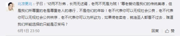 “The senior people should not disregard social public order by taking advantage of their age,” another user @beilianggengbei said. He further noted that the seniors should only be respected for their deeds instead of their age.
