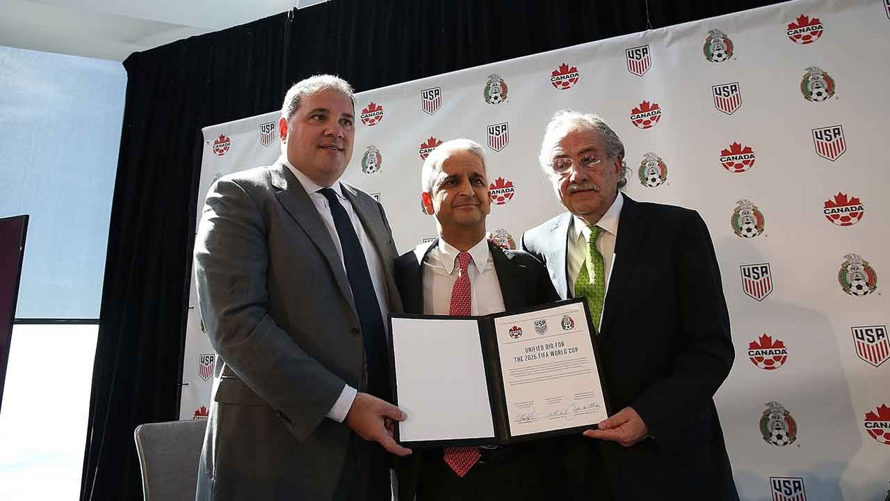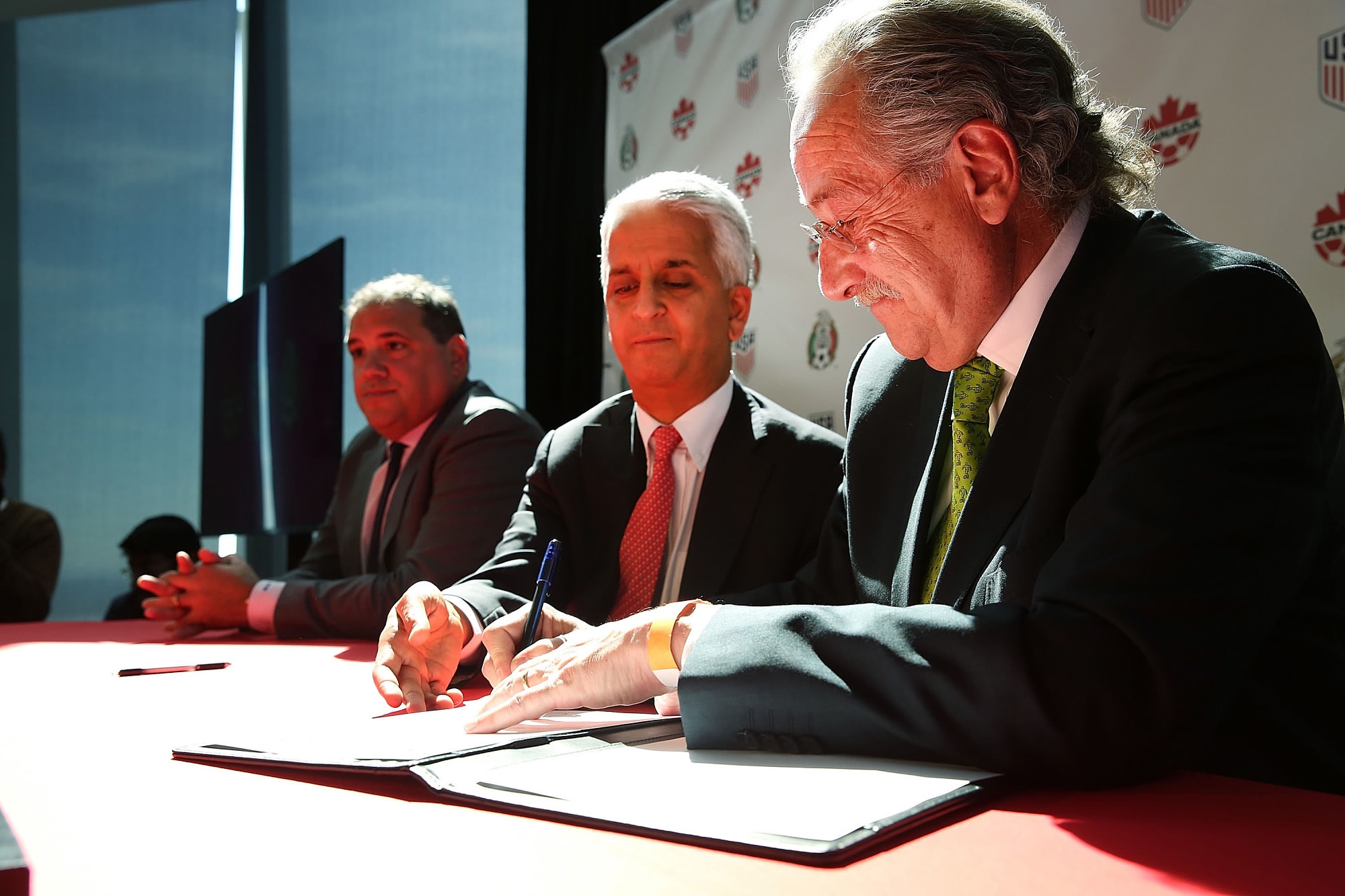 Sunil Gulati (C), president of the United States Soccer Federation (USSF), Canadian CONCACAF President Victor Montagliani (L) and Mexican Football Federation President Decio De Maria sign a unified bid for the 2026 soccer world cup in New York city on April 10, 2017./VCG Photo