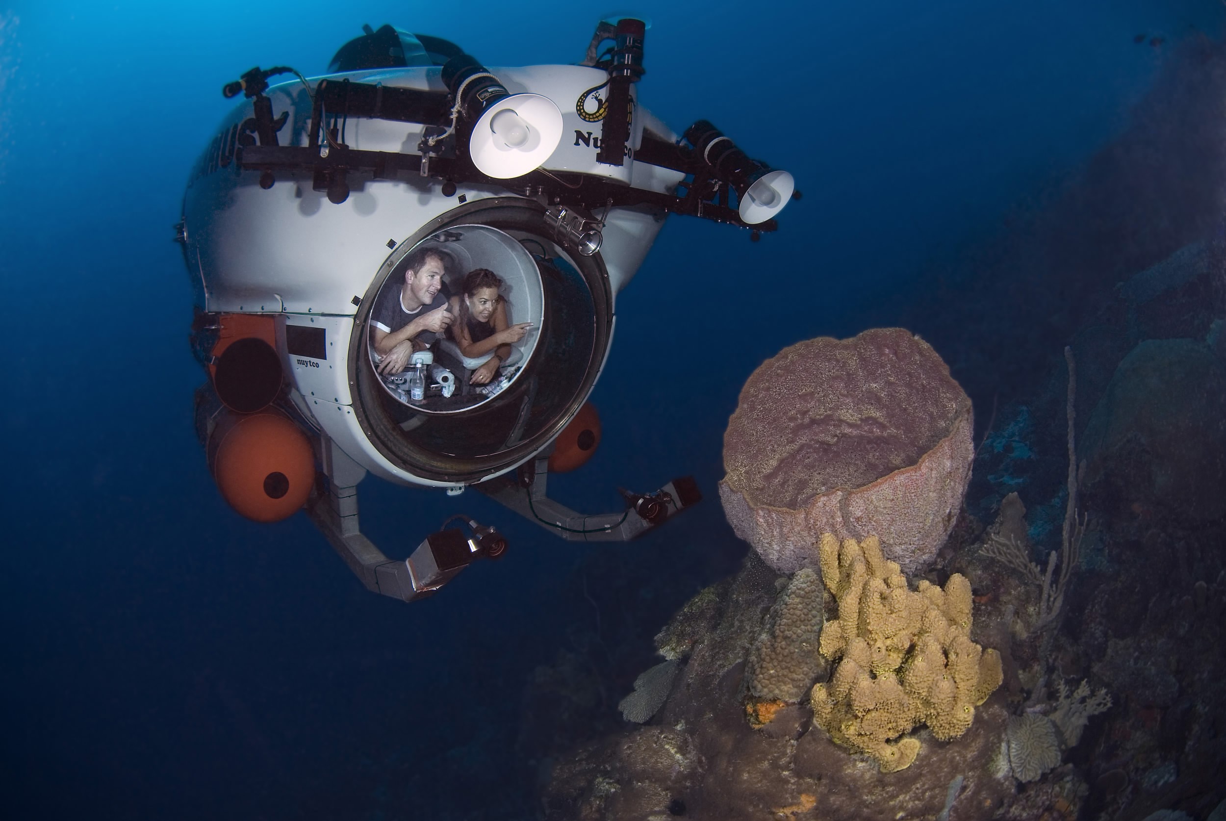 Mini submarine with people looking at creatures in the deep sea. /VCG Photo