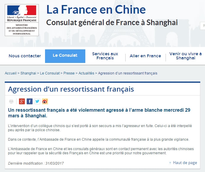 The Consulate General of France said on Friday morning that a French national was “violently assaulted with a knife” in Shanghai, according to a statement posted on its official website.