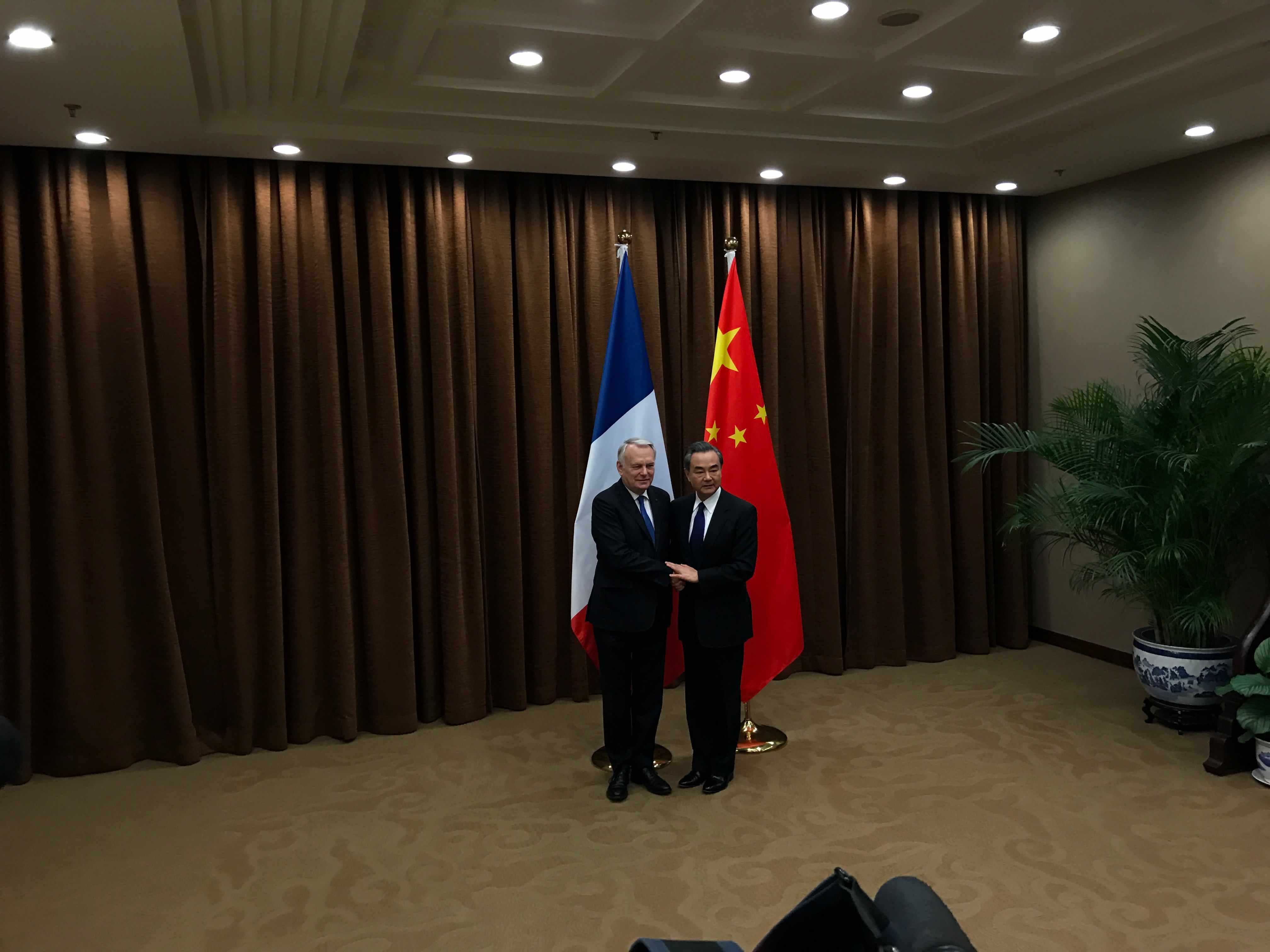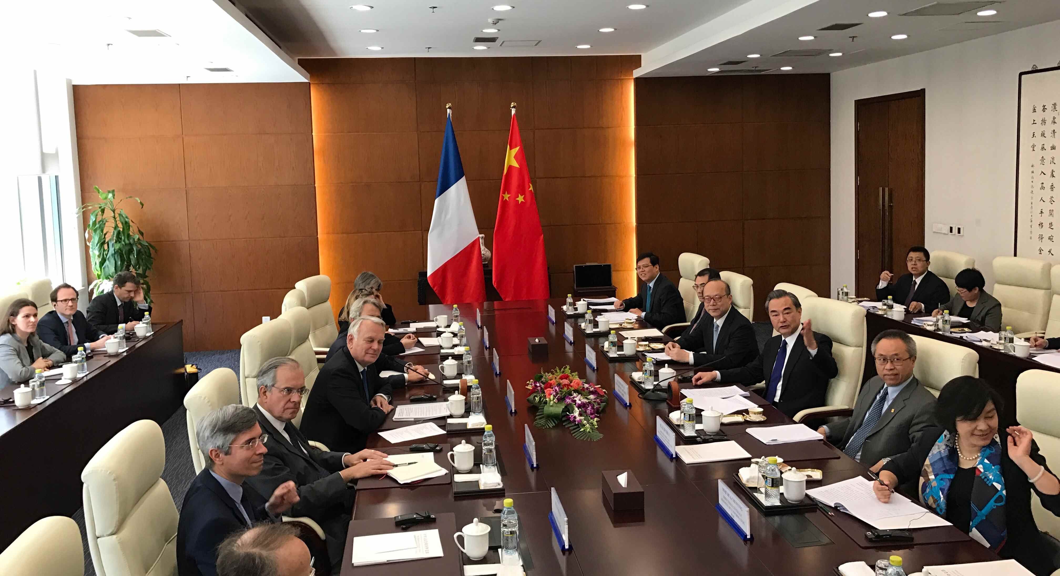 Chinese Foreign Minister Wang Yi talks to his French counterpart Jean-Marc Ayrault on April 14, 2017. /CGTN Photo
