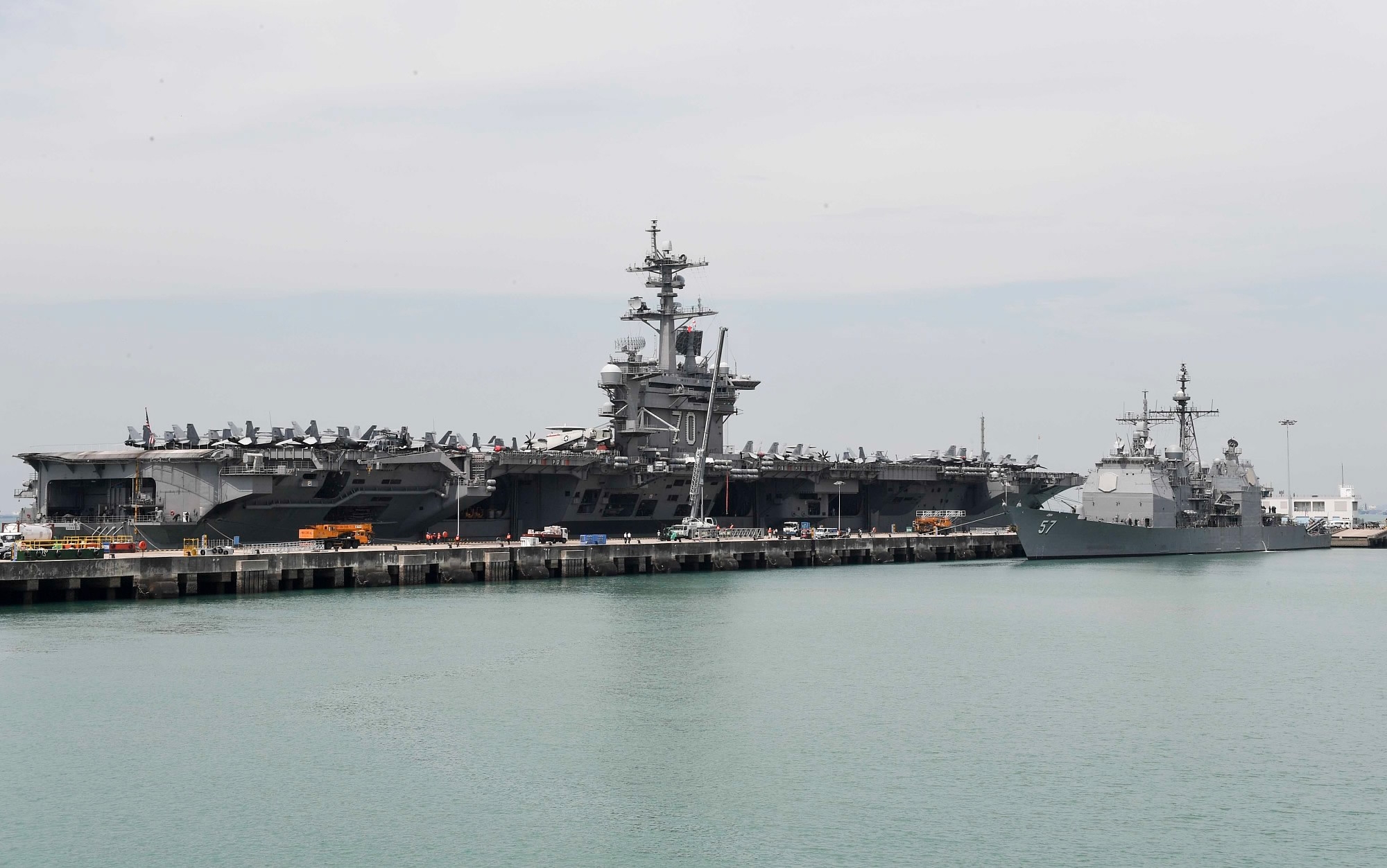 This US Navy handout photo obtained on April 12, 2017 shows Nimitz-class aircraft carrier USS Carl Vinson moor at Changi Naval Base, Singapore, for a scheduled port visit on April 4, 2017. /CFP Photo