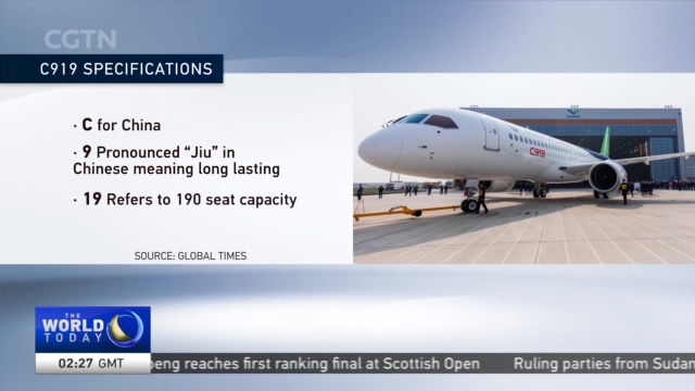 The C919's name is meant to convey its status to the world. C for China The number 9 is pronounced "Jiu" in Chinese, meaning "Long Lasting". And 19 for the 190 seat capacity in its largest configuration. The new narrow body jet is 38.9 meters long, nearly 12 meters high with a wingspan of 35.8 meters. The C919 has a range of 5,555 kilometers with a top speed of about a thousand kilometers per hour. It can fly at an altitude of 12,100 meters.