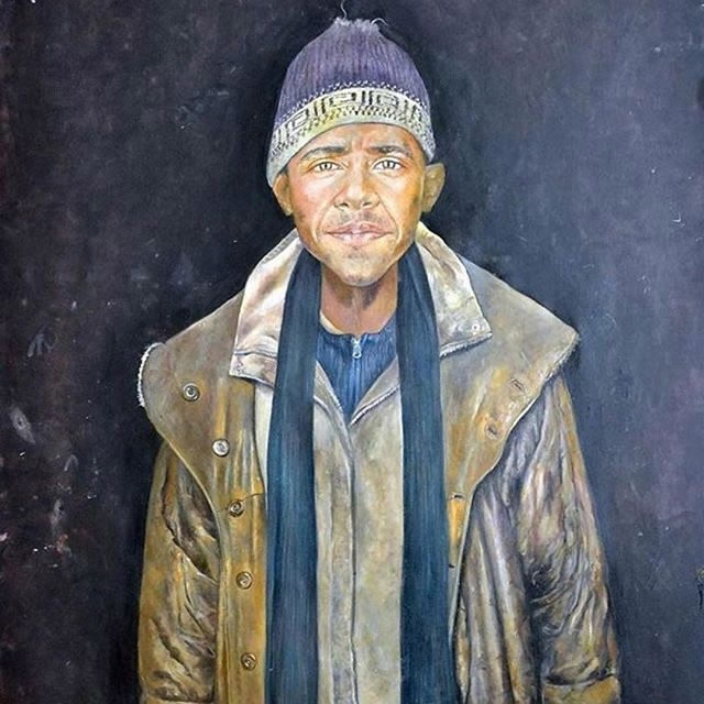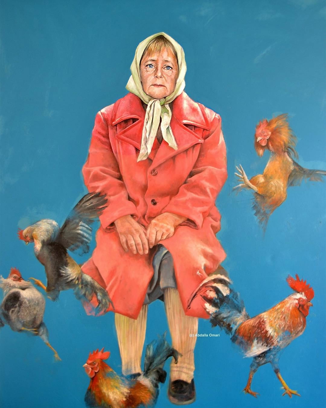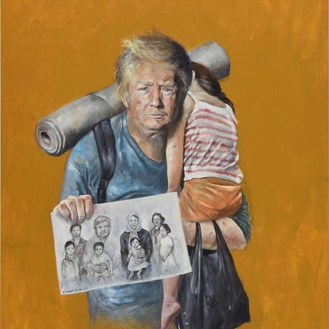 Abdalla Al Omari's "The Vulnerability Series" includes paintings of US President Donald Trump as a bedraggled refugee with a sleeping child in his arms, Russian President Vladimir Putin as a beggar, as well as former British Prime Minister David Cameron and former Iranian President Mahmoud Ahmadinejad.