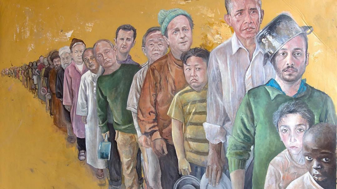 A Syrian refugee artist has spent 19 months creating a series of paintings in his Brussels studio showing world leaders as displaced or disenfranchised people and is showing them in a Dubai gallery.