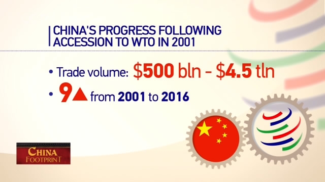 China’s full opening up was marked by its accession to the WTO in 2001. Since this monumental event, trade volume has jumped from 500 billion US dollars to 4.5 trillion dollars. That's a nine-fold increase from 2001 to 2016. And China has also become the biggest export country from a sixth place ranking in 2001. China’s commitments to join the WTO were all fulfilled. The country carried out unprecedented law reviews and clean-up, making China's market access conditions more transparent and standardized.