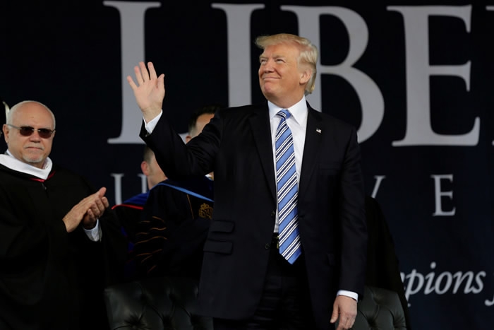 US President Donald Trump waves before delivering a keynote address at Liberty University's commencement in Lynchburg, Virginia, the US on May 13, 2017. /VCG Photo