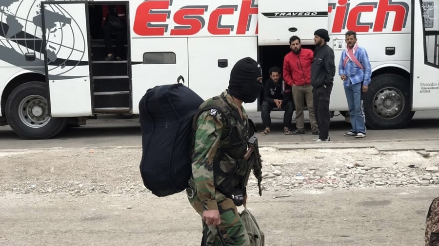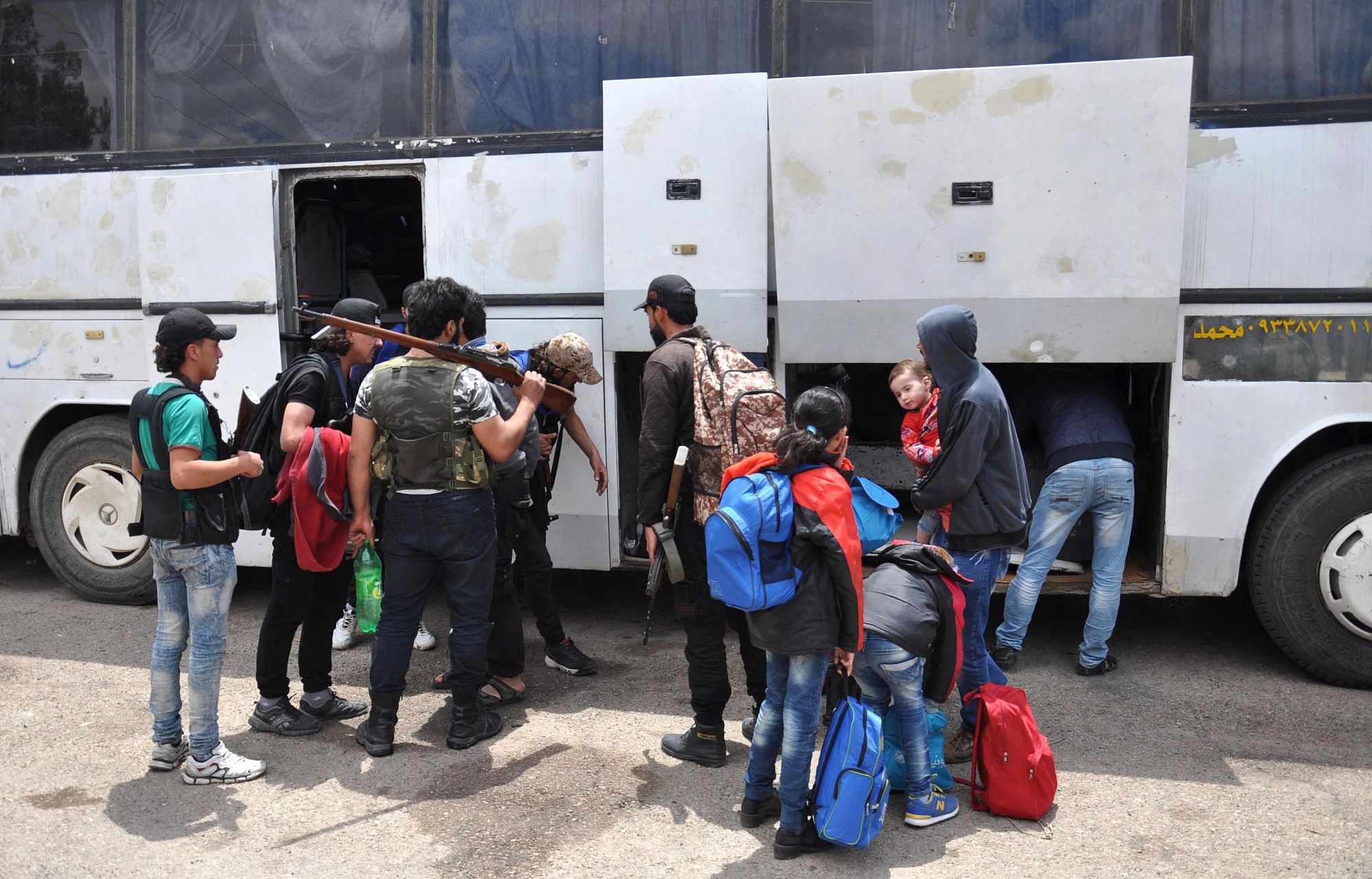 Rebel fighters and their families evacuate the besieged al-Waer neighborhood, after an agreement was reached with Syria's army, in Homs, May 20, 2017. / VCG Photo