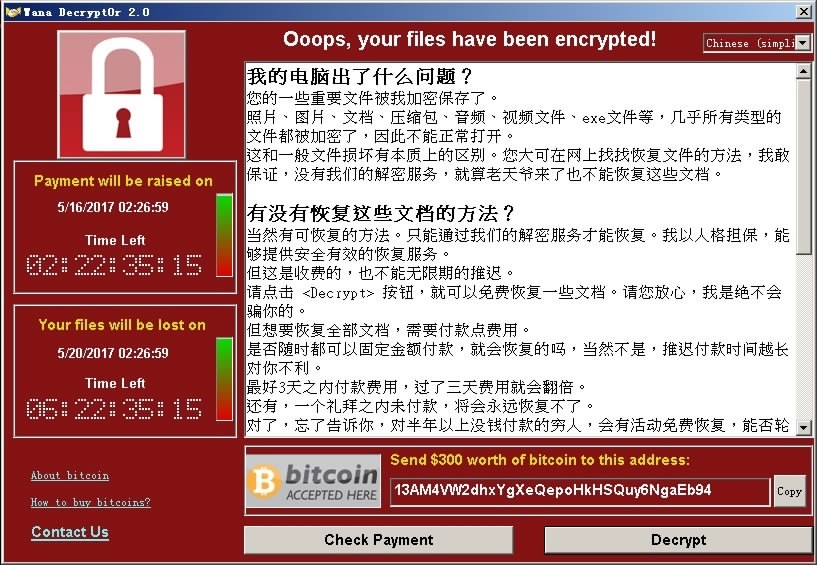 Flashpoint, a US intelligence company, said on its website on May 25 that authors of the WannaCry ransomware message are fluent in Chinese.