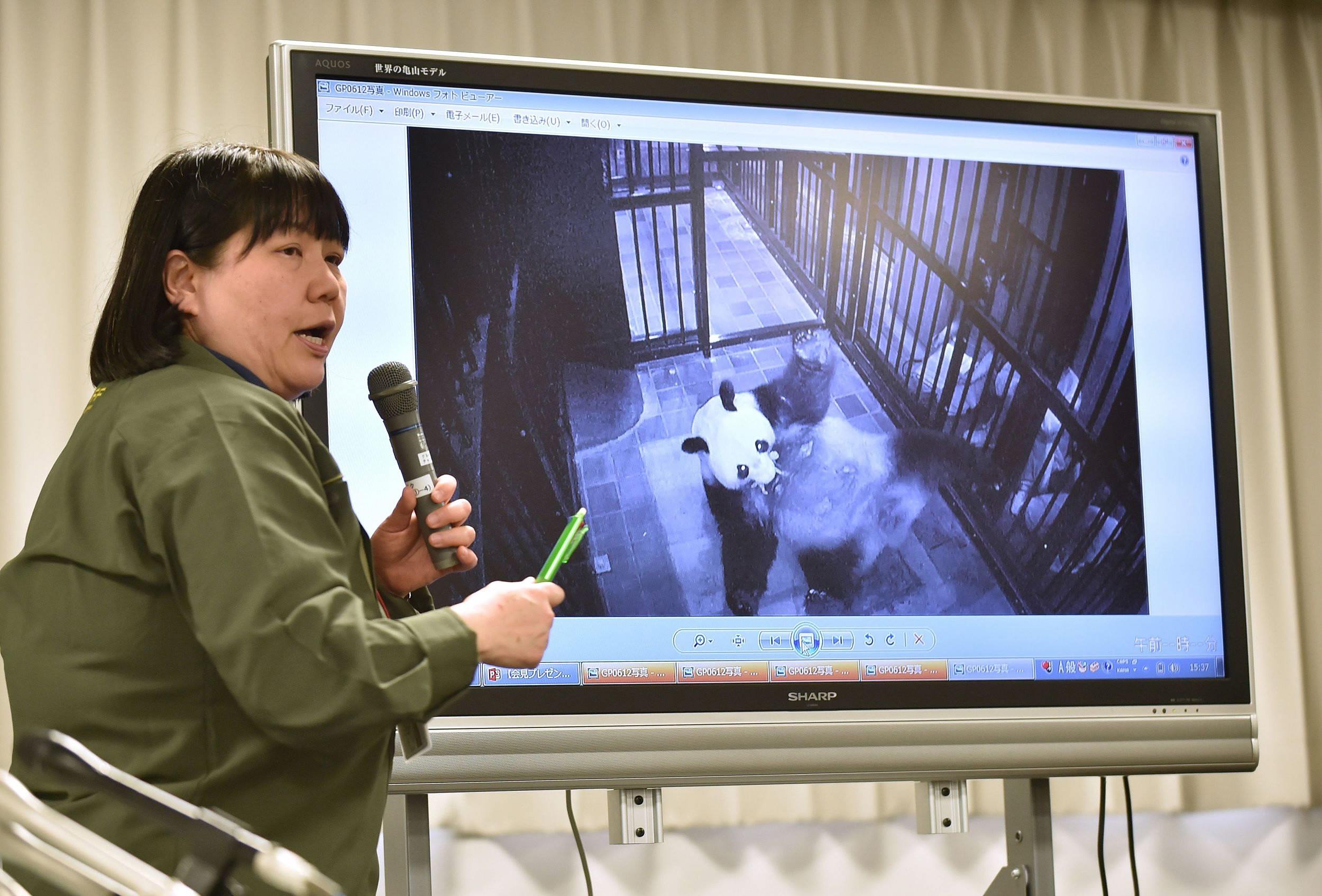 Ueno Zoological Gardens official Mikako Kaneko shows an image of the birth of a baby panda during a press conference in Tokyo. / CFP Picture