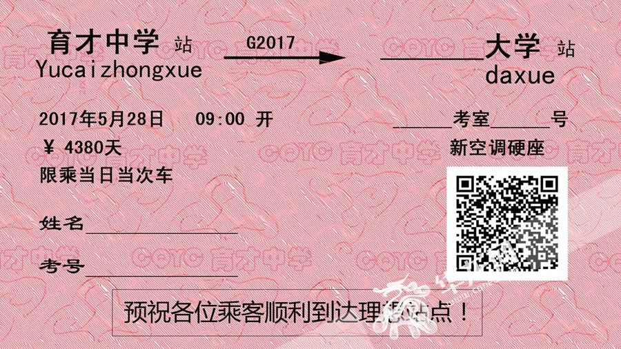 The train number G2017 represents the year the students are taking Gaokao, and the time of departure marks the day they took their practice test.