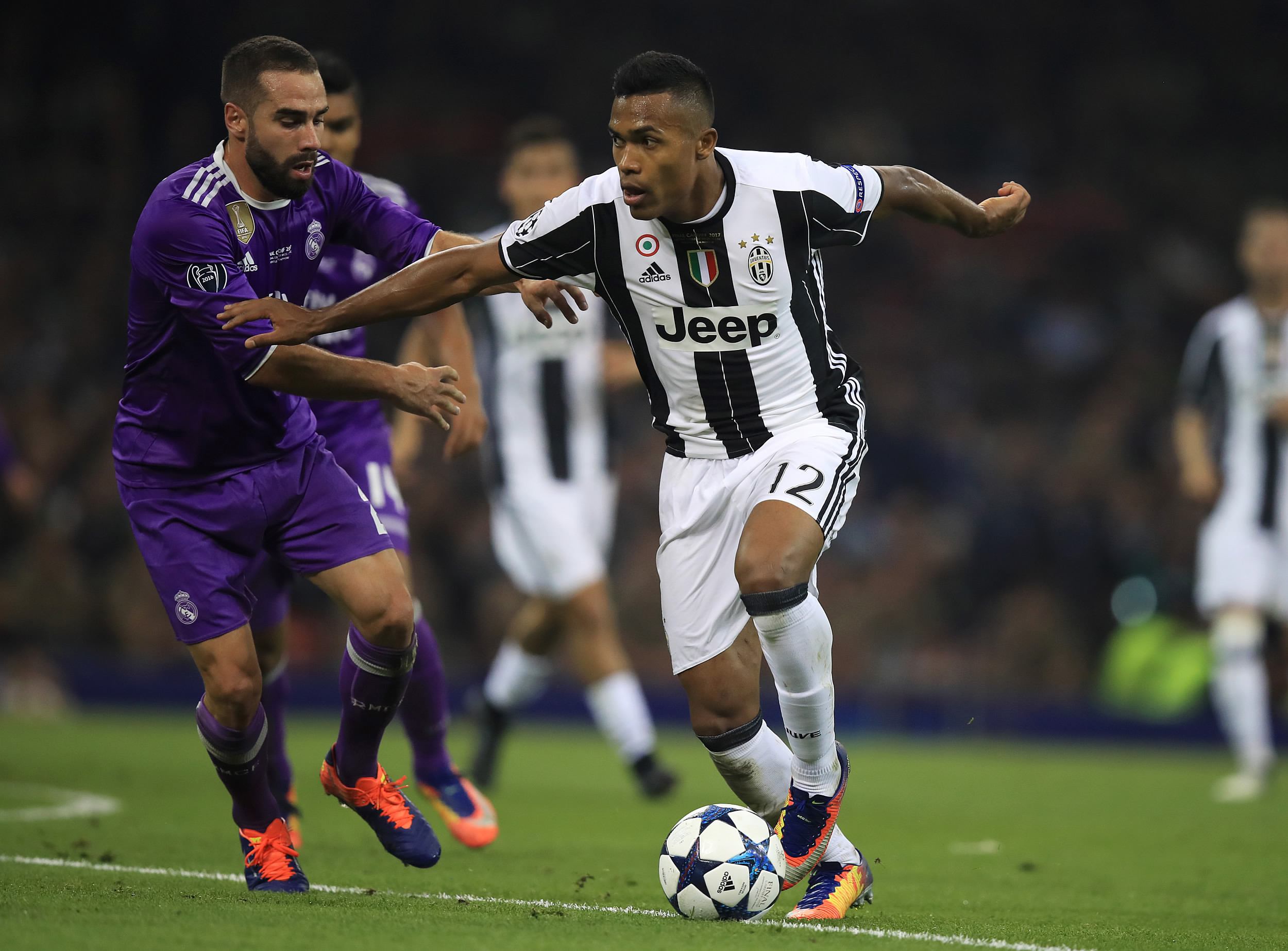 Real Madrid's Dani Carvajal (left) and Juventus' Alex Sandro battle for the ball. /VCG Photo