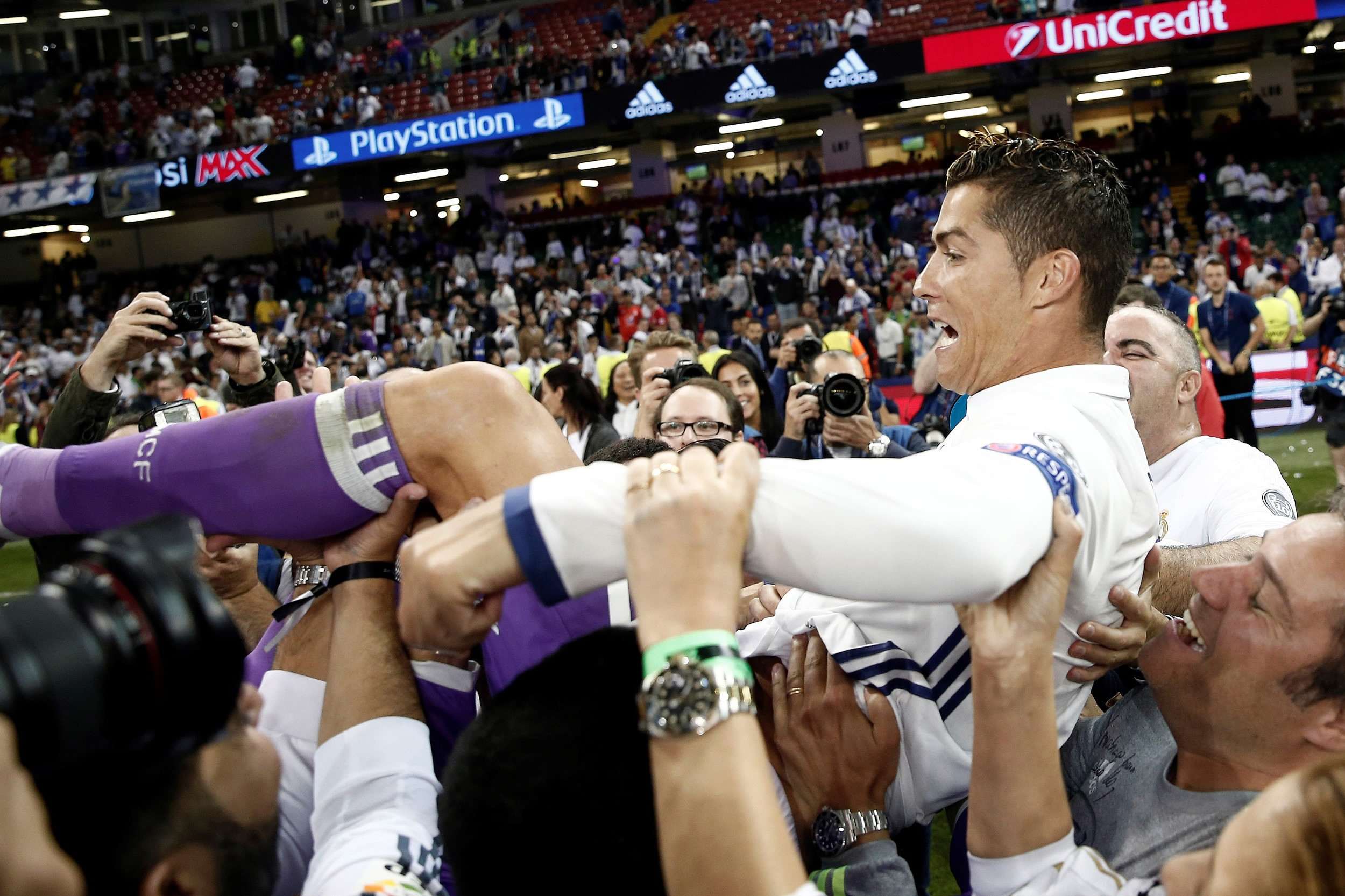 Teammates throw Cristiano Ronaldo in the air. /VCG Photo