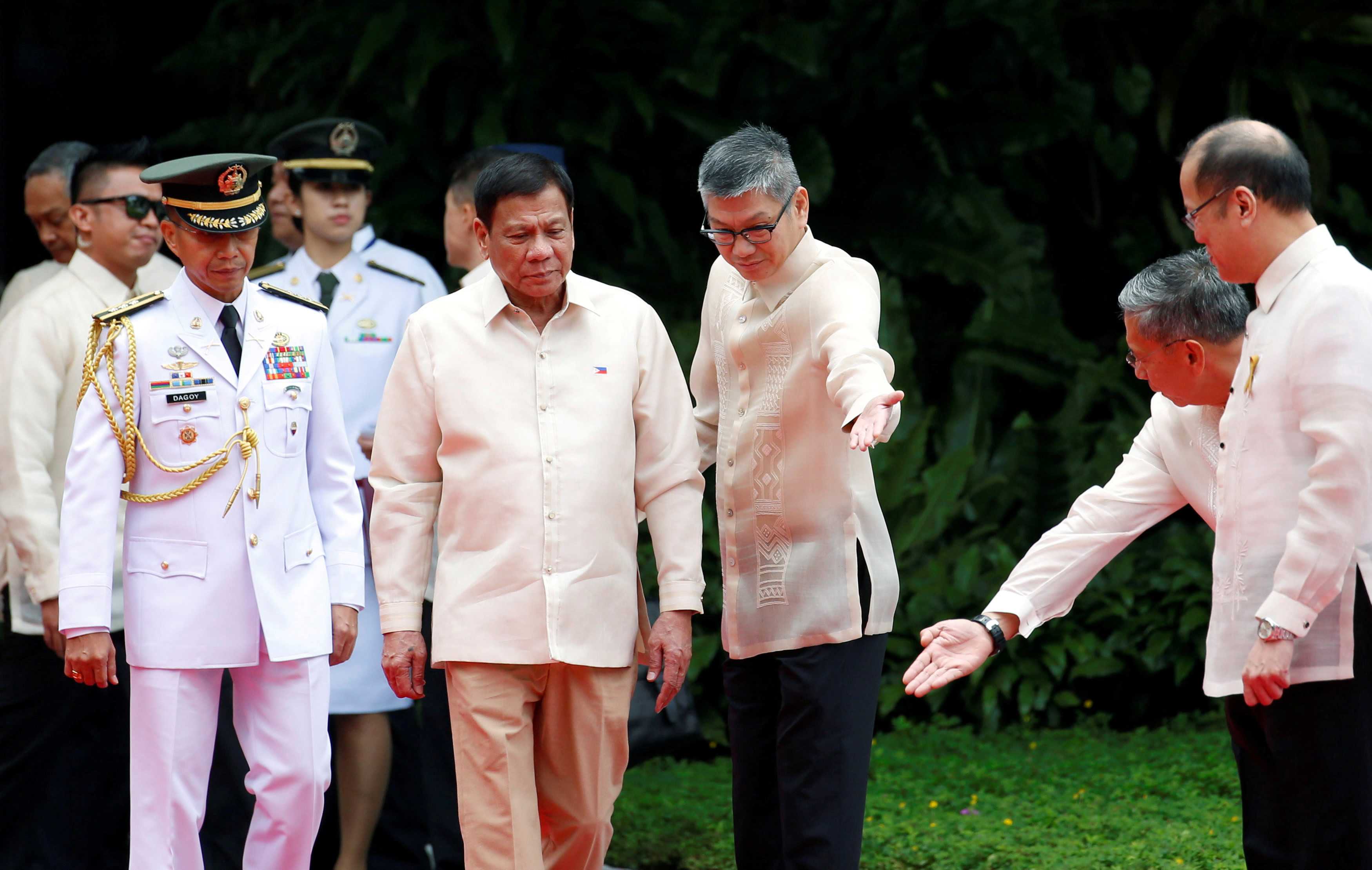 Incoming President Rodrigo Duterte walks towards outgoing President Benigno Aquino III before the latter leaves the Malacanang Palace in Manila, Philippines on June 30, 2016. /Reuters Photo