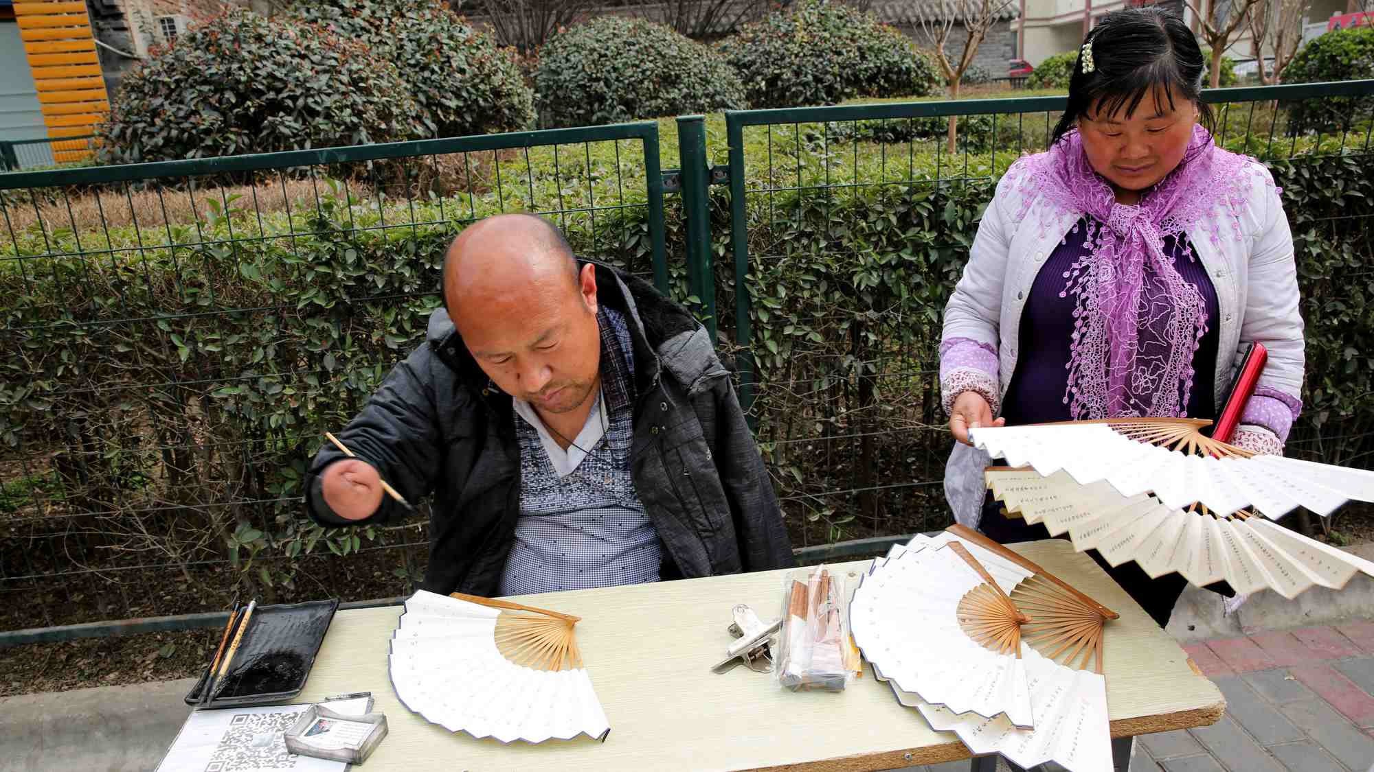 Jia practices calligraphy with the help of his wife and sells his work outside tourist attractions in the city.