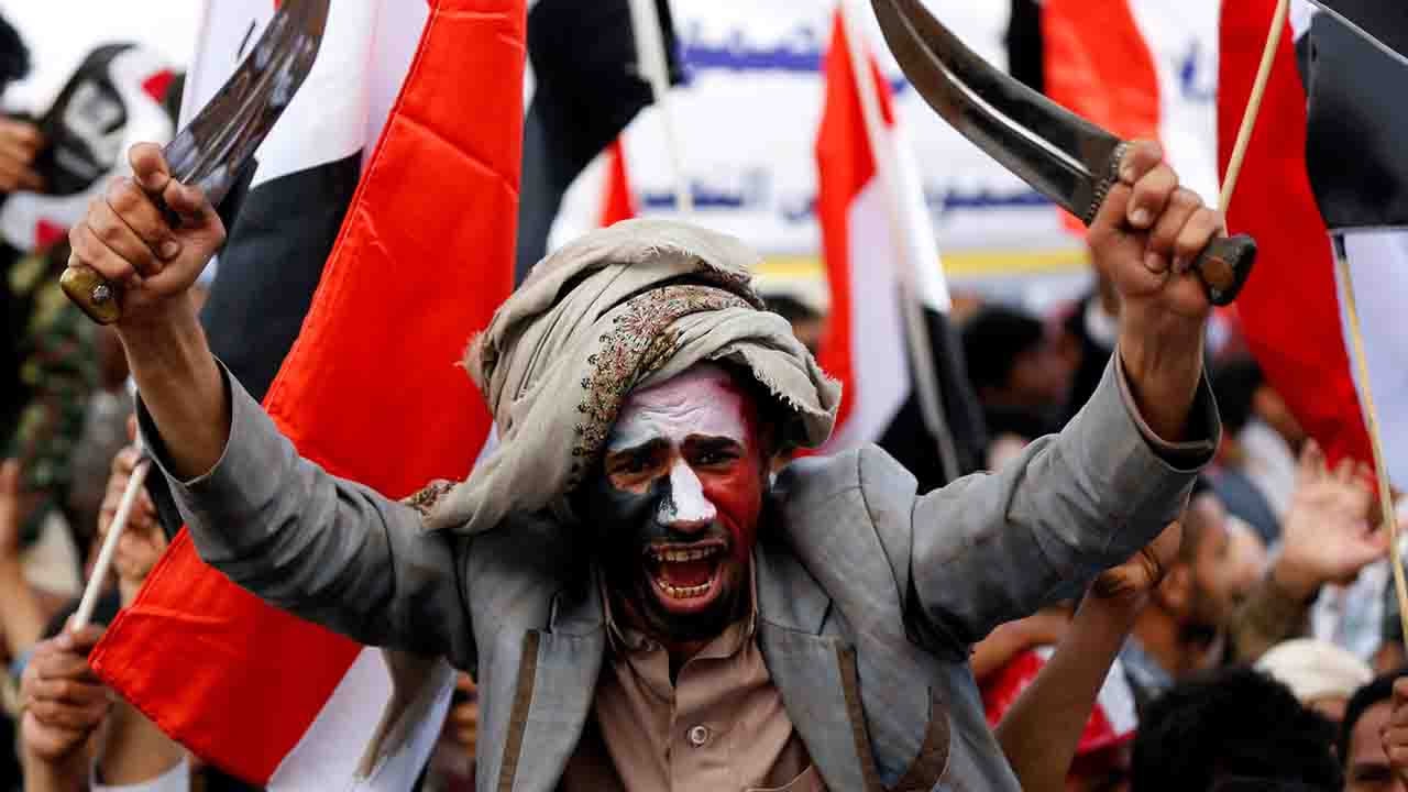 A man waves traditional daggers as he attends with supporters of the Houthi movement and Yemen's former president Ali Abdullah Saleh a rally to mark two years of the military intervention by the Saudi-led coalition, in Sanaa, Yemen March 26, 2017. /CFP Photo