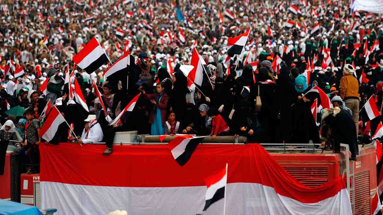 Thousands of Yemenis in support of Shiite Houthi rebels converged on Al-Sabeen Square on Sunday in the capital Sanaa to mark the second anniversary of the civil war.
