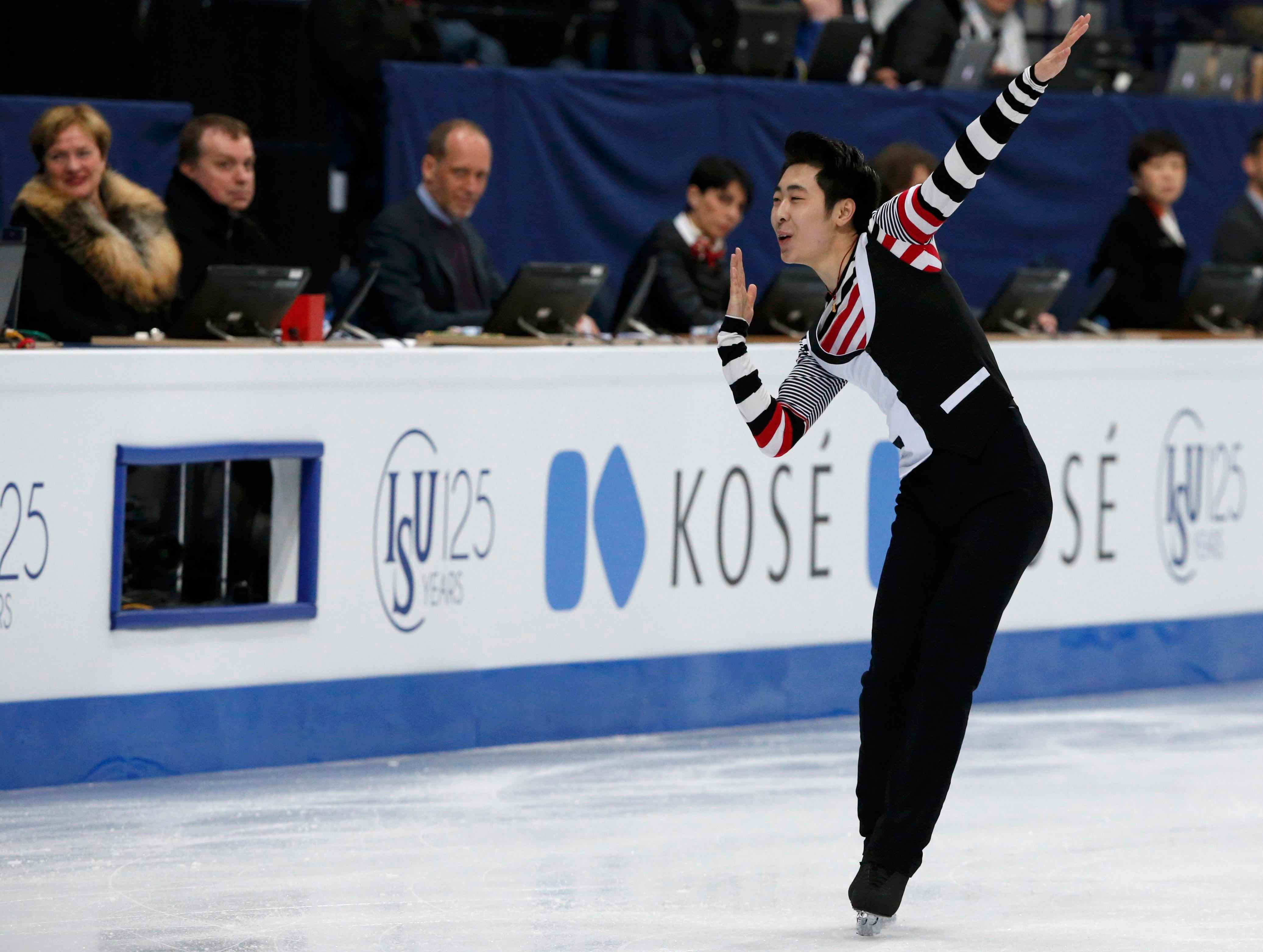 Nineteen-year-old Jin was fourth after the short program on Thursday but a flawless free skate to music from the film “La Strada” meant he finished with a career best total of 303.58 points, overtaking Canada’s three-time world champion Patrick Chan to finish third.