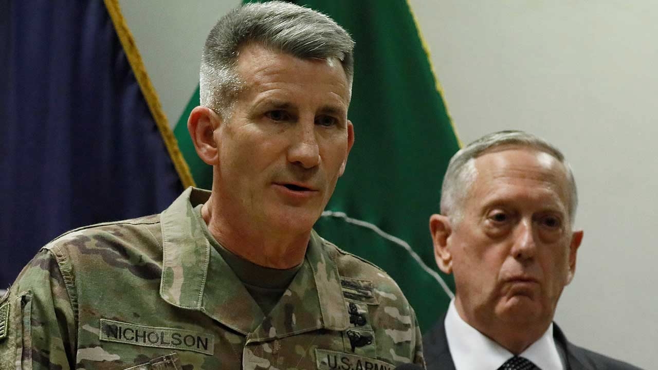 General John Nicholson, head of US and international forces in Afghanistan on Monday answering questions about a Taliban bomb attack. /VCG Photo