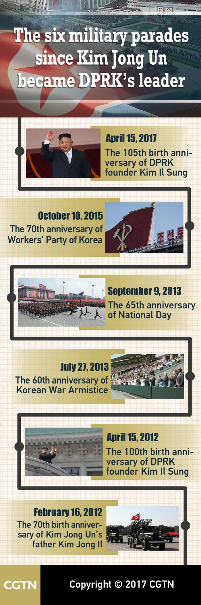 The parade was part of the grand celebrations to mark the 105th anniversary of the birth of Kim Il Sung, founder of the DPRK and the grandfather of Kim Jong Un. Known as the "Day of the Sun," Kim Il Sung's birthday has been held the most important holiday of the country.