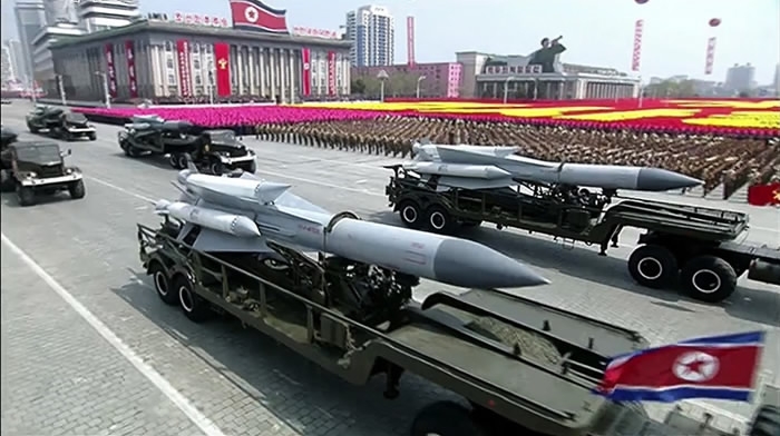 Displayed were its submarine-launched ballistic missiles for the first time in the parade, which analysts call a show of strength as the US threatens to attack Pyongyang for its nuclear and missile tests.