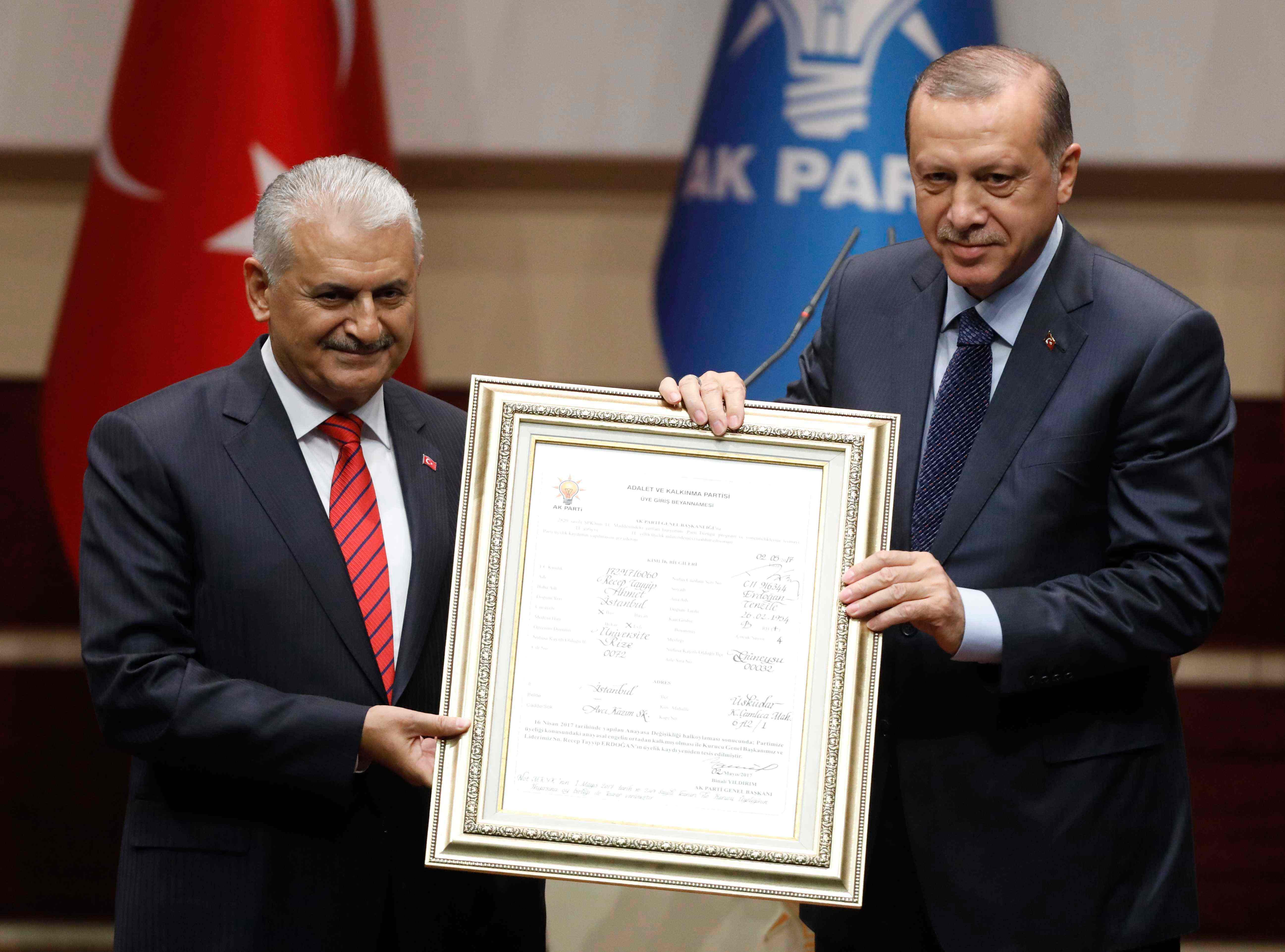 Turkish Prime Minister Binali Yildirim presents President Tayyip Erdogan with his AK Party membership document at the party's headquarters in Ankara, Turkey, on May 2, 2017. /Reuters Photo