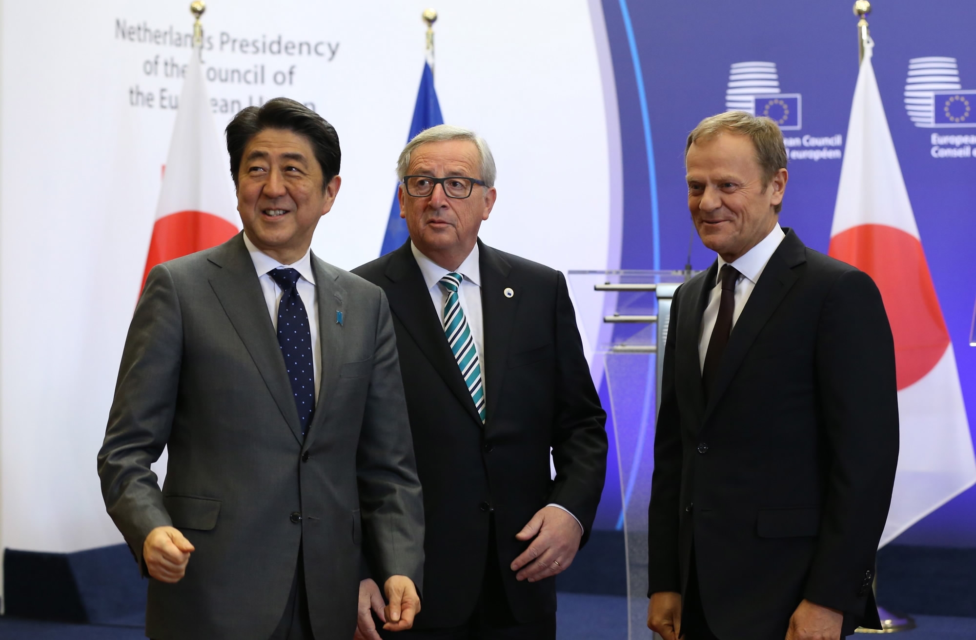 Japanese Prime Minister Shinzo Abe with President of the European Council Donald Tusk (R) and President of the European Commission Jean-Claude Juncker (C) in May 2016. /CFP Photo