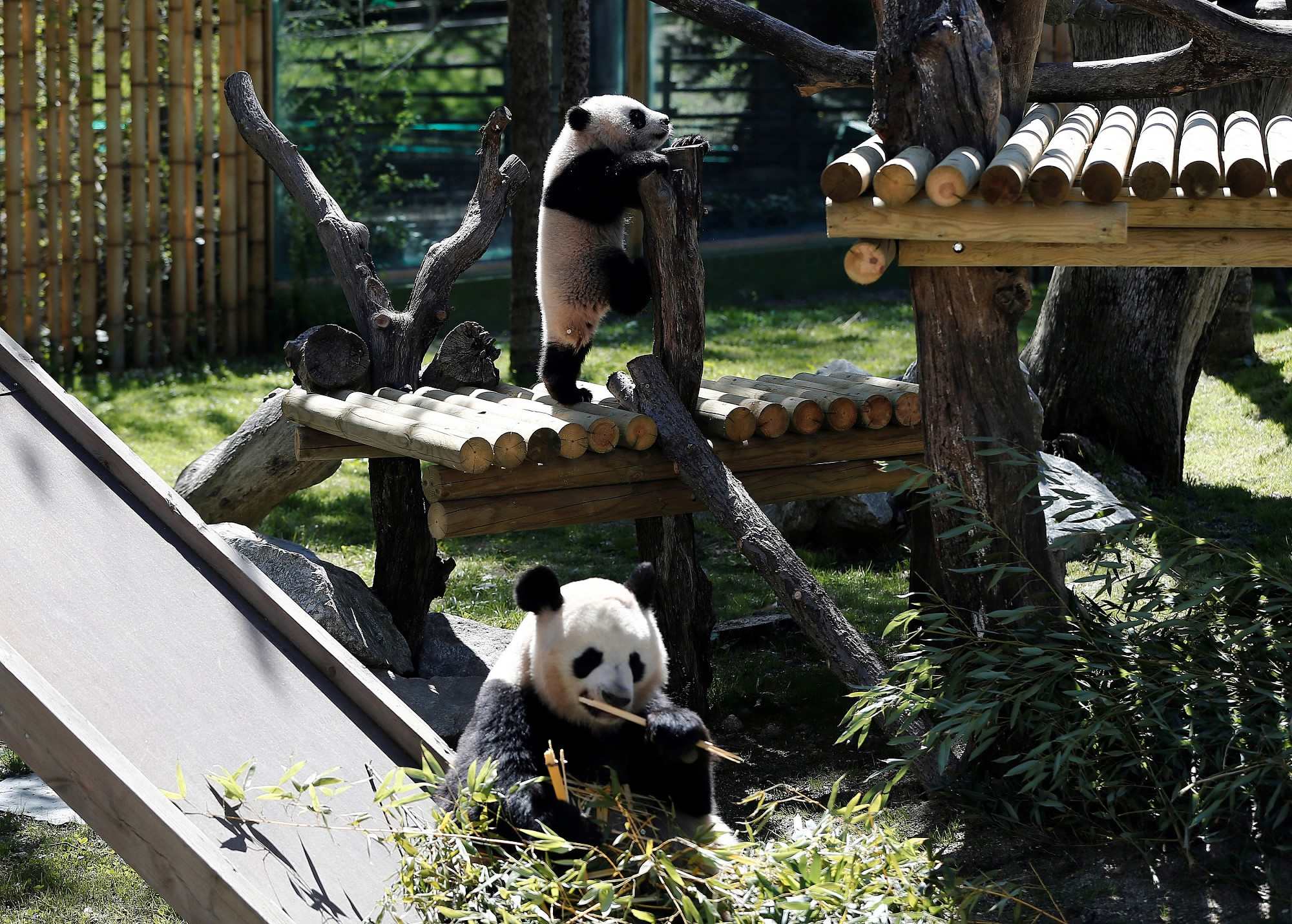 Female panda "Chulina", which was born last August, goes open space with its mother Hua Zui Ba for the first time at the zoo in Madrid, Spain on April 5, 2017.