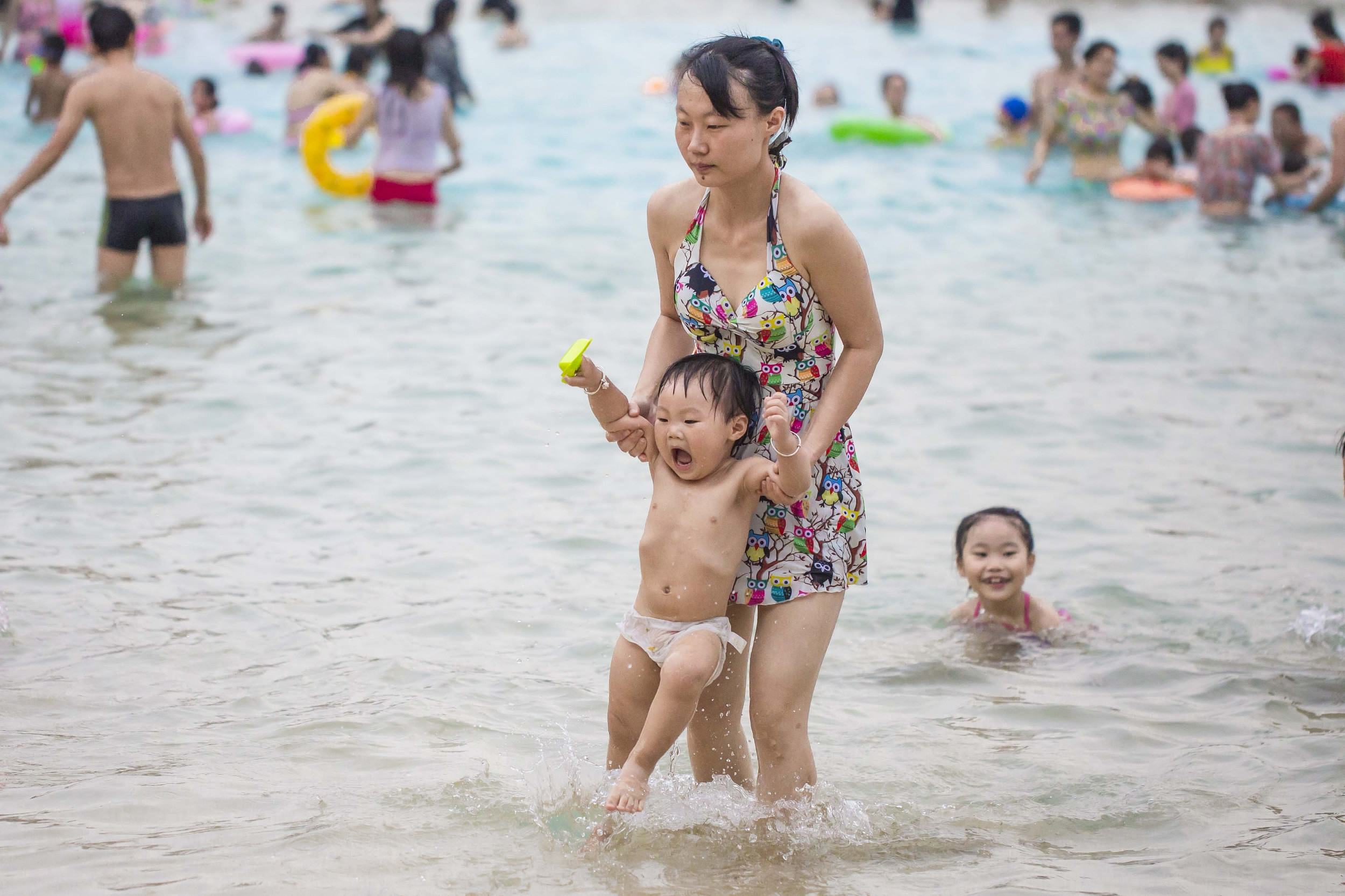 Mother plays with children at an open air swimming pool. /VCG Photo