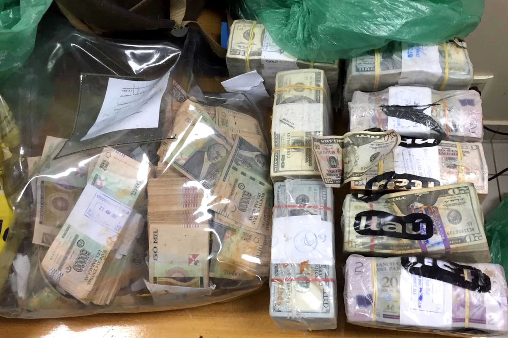 An assault rifle and money seized from presumed members of the gang that robbed a secure vault containing millions of dollars in Ciudad del Este /CFP Photo
