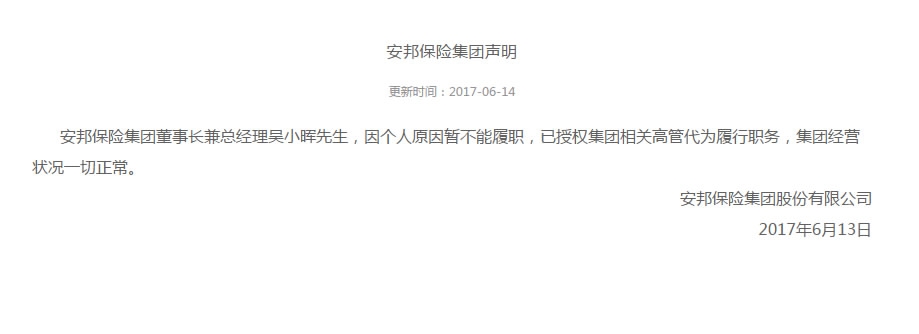 Anbang Insurance Group on Tuesday said Chairman Wu Xiaohui has been unable to perform his duties for personal reasons, according to a statement posted on the company's official website.