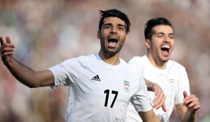 Iran's Mehdi Taremi (L) celebrates after scoring a goal against China during a FIFA 2018 World Cup Qualifier in Tehran, Iran on March 28, 2017. /CFP Photo