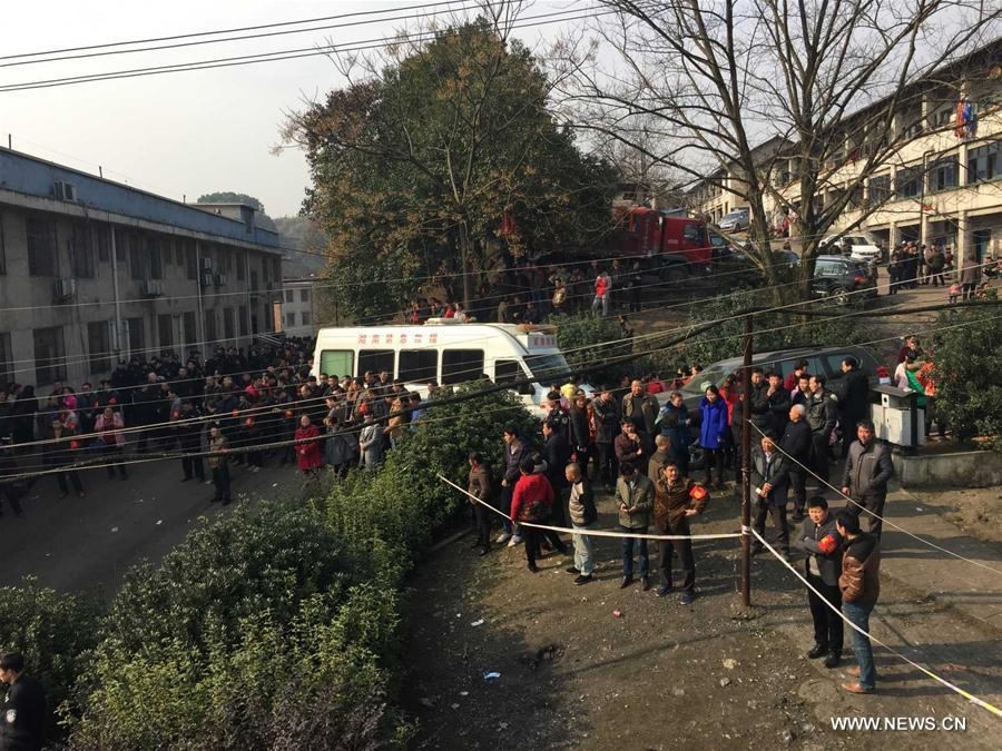People wait outside the coal mine blast site in Lianyuan, central China's Hunan Province, Feb. 14, 2017. Eight people were confirmed dead after a blast hit the coal mine, local authorities said on Tuesday. / Xinhua