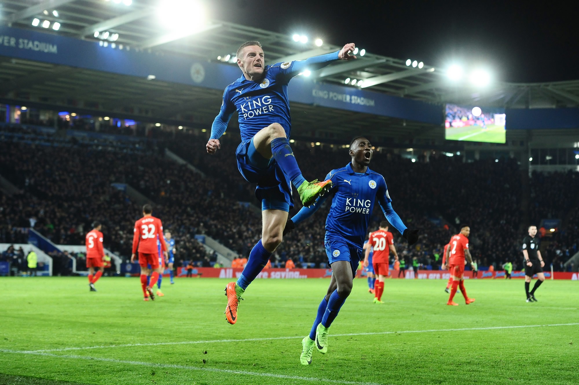 Jamie Vardy of Leicester City celebrates after scoring to make it 3-0 during the Premier League match between Leicester City and Liverpool on February 27, 2017 in Leicester, UK. /CFP Photo